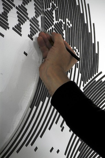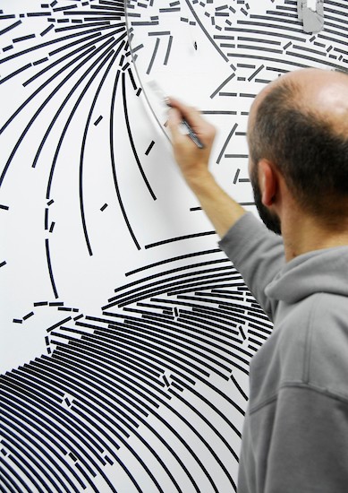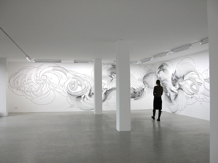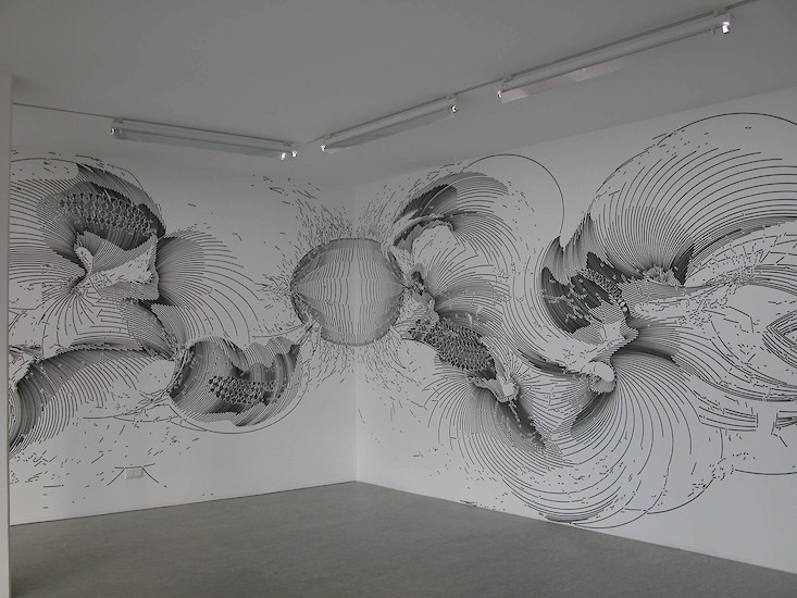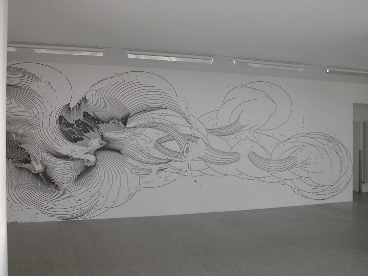 Für seine Zeichnungen führt der Künstler mit Hilfe einer Ellipsen-Schablone den Tuschepinsel über die Wand bzw. das Papier. Die Zeichnungen sind also keineswegs computergeneriert, wie es auf den ersten Blick erscheinen mag - allerdings durchaus Ergebnis der Beschäftigung mit dem Computer. "Es reizt mich besonders, Zwischenpositionen einzunehmen", sagt Mayer, "zwischen Computerzeichnung und Freihandzeichnung beispielsweise, da sich aus solch einer Haltung heraus mit Leichtigkeit Vorstöße in die verschiedensten Richtungen unternehmen lassen." Zu den jüngsten Vorstößen gehören "Plots": sie basieren auf Tuschezeichnungen und werden mit Hilfe eines computergesteuerten Folienschnitts an Wand oder Decke "gedruckt" – wie im Aufgang zur Oechsner Galerie.