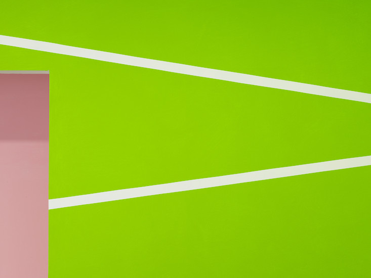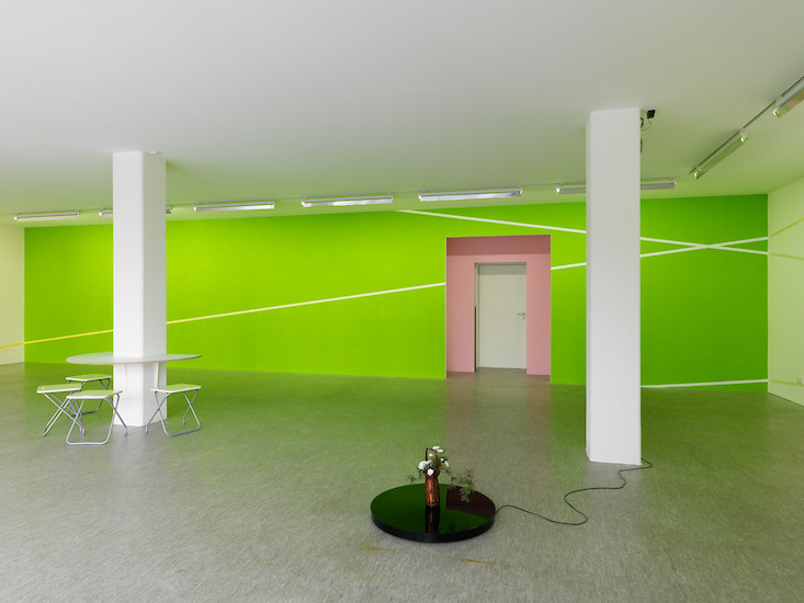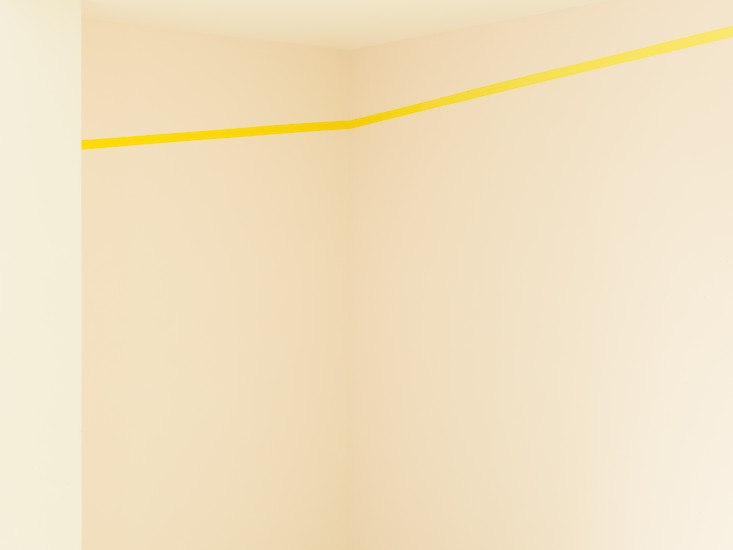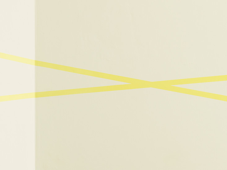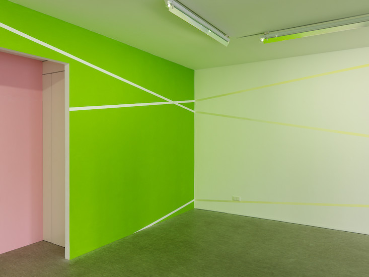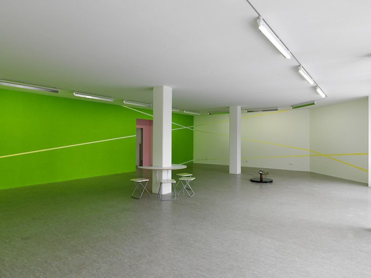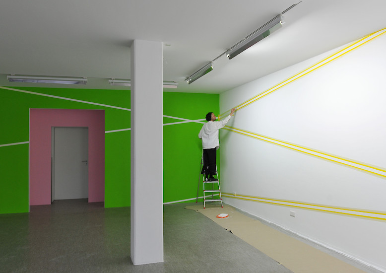 In der Oechsner Galerie hat sich Christian Faul nun erstmals vom zweidimensionalen Bildträger gelöst und den gesamten Galerieraum als Bildraum genutzt. Der Künstler hat innerhalb von zwei Wochen in Situ das dreidimensionale Raum-Bild "tirza" realisiert.