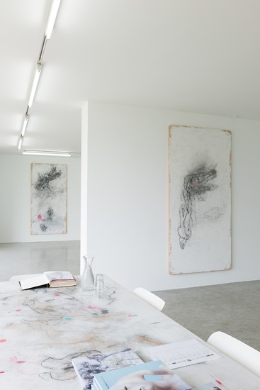 Doch auch als Zeichner bleibt er Bildhauer: „Ganze Partien der Bildoberfläche behandelt er mit Schleifpapier, was sie rau, schrundig und von turbulenter Materialität macht. Hybridität schlägt auch in der bildhauerischen Methode des Zeichnens durch. Das Changieren zwischen materieller Dichte, leeren Bildpartien, zeichnerisch scharf notierten Details und malerisch flüchtiger Lavierung, verleiht den großformatigen Zeichnungen ihre bildnerische Spannung.“